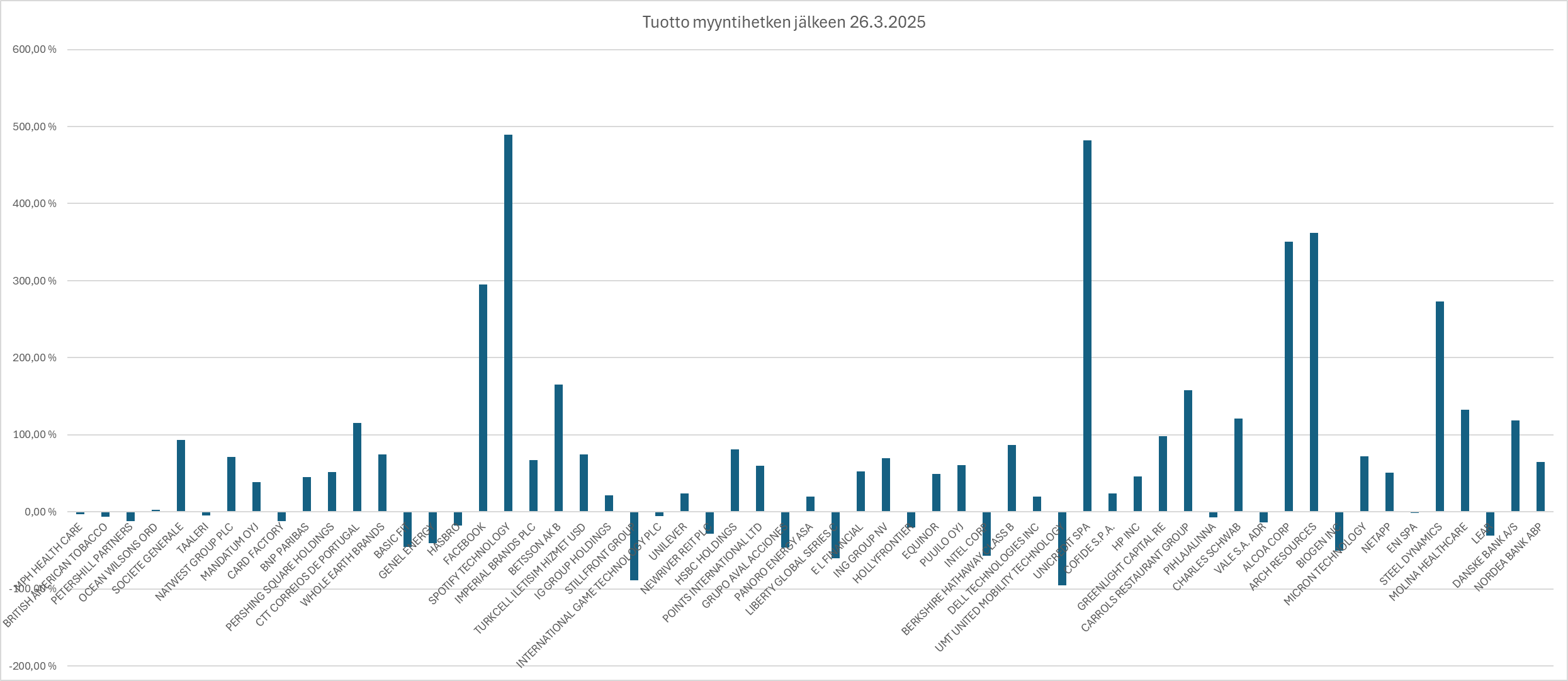 Vuodesta 2015 vuoden 2025 alkuun, eli noin 10 vuoden ajanjaksolla, on tapahtunut 70 osakkeiden myyntitapausta. Tuottojen vaihteluväli on melkoinen: eräs Qt:n osakkeiden rypäs on myyty +2300 % tuotolla. Toisaalta Pantaflixit lensi laitaan -90 % punaisella. Joillakin osakkeilla on onnistuttu realisoimaan sekä voittoja että tappioita. Esim. Momentumin myynnillä on tehty -15 %, mutta ostin ne pian takaisin ja lähdin uudestaan ulos +70 % voiton kanssa (tässä ei ole kauheasti juhlittavaa, koska myynnin jälkeen osake vielä tuplasi).