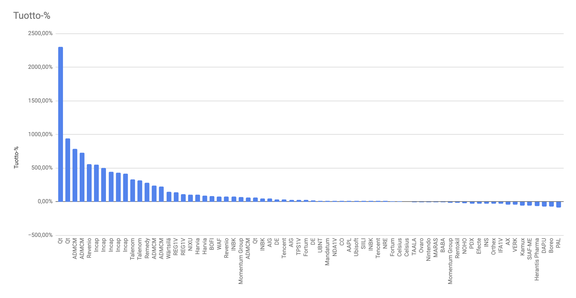 Jos katsotaan realisoituneiden nettovoittojen jakaumaa, vastaa Qt peräti 38 % voitoista, Incap 32 %, Admicom 13 % ja Revenio noin 10 %. Muutamat superonnistumiset ovat tuoneet siis valtaosan voitoista, ja samalla kompensoineet tappioita. Absoluuttisesti tappiot sijaitsevat kahdessa karmeassa virheessä. Boreo vastaa 38 % kaikista tappioista, Kamux 17 %. Loput tappiot ovat absoluuttisestikin katsottaessa pienempiä, vaikka prosentit voivat olla suuria. Pantaflixin -90 % romahdus 2018 kyllä sivalsi salkusta siivun tuolloin pois, mutta nyt kun katsoo summia tuo ei joukosta kauheasti erotu.