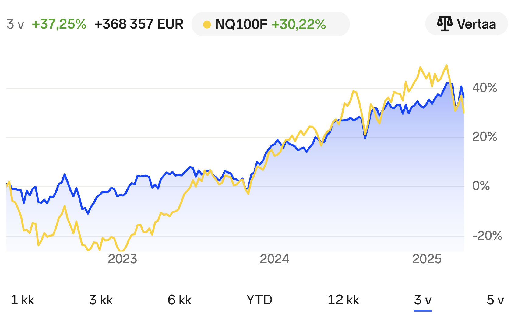 Q1 on vain pari prosenttia plussalla, mutta kolmen vuoden ajanjaksolla olen kuitenkin voittanut Hesulin ja USA:n indeksit ![]()