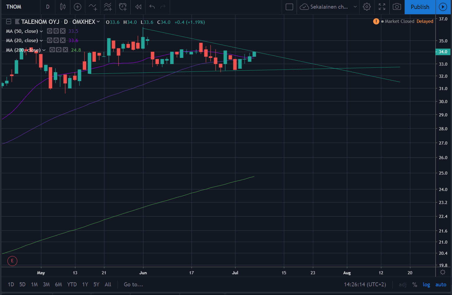 - Toiseksi Nokian Q2 löi selvästi odotukset, mistä seurannut kurssinousu siivitti Nokiasta saadut tuotot treidien aloituksesta alkaen mukavasti plussalle. Tätä kurssinousua olin odottanut, mutta en kylläkään ihan näin nopeasti.