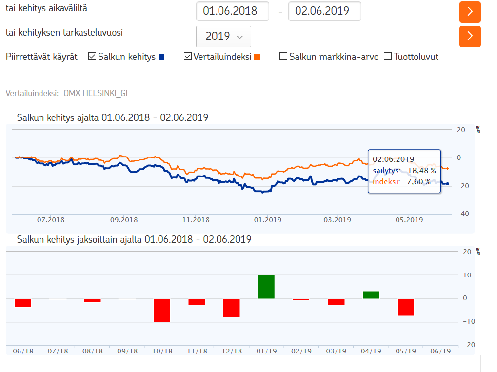 - Tilikausi on ollut pitkälti hyvin hankala, matkalla nähtiin joulukuun osakemarkkinan korjausliike, siitä myös tosin kova korjausliike ylöspäin tammi-helmikuussa ja nyt taas tilanne on vähän hankaloitunut mm. kauppasodan eskaloitumisen takia. Valitettavasti tämän erittäin huonon salkun kehittyksen tällä aikavälillä selittää Outokummun epäonnistunut sijoitus heinä-toukokuun ajalta (ks. Sijoitusvirheet-ketju). Myös esimerkiksi Nordean kehitys on on ollut tällä aikavälillä suuri pettymys, kun h.hintaan 8,63€ ostetut osuudet jouduttiin myymään karvaalla tappiolla ulos, ja kokonaiskehitys myös alun perin ostettujen Nordean osakkeiden kanssa on ollut heikkoa, ja voitolle jäätiin juuri ja juuri: