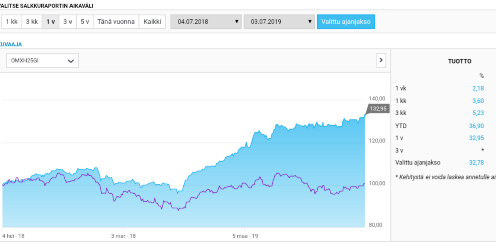 En ollutkaan aikoihin katsonut salkkuni kokonaiskehitystä, joten kirjauduin pitkästä aikaa Nordnettiin katsomaan tilannetta ketjun innoittamana ja muutenkin. Tältä näyttää 1v graafi