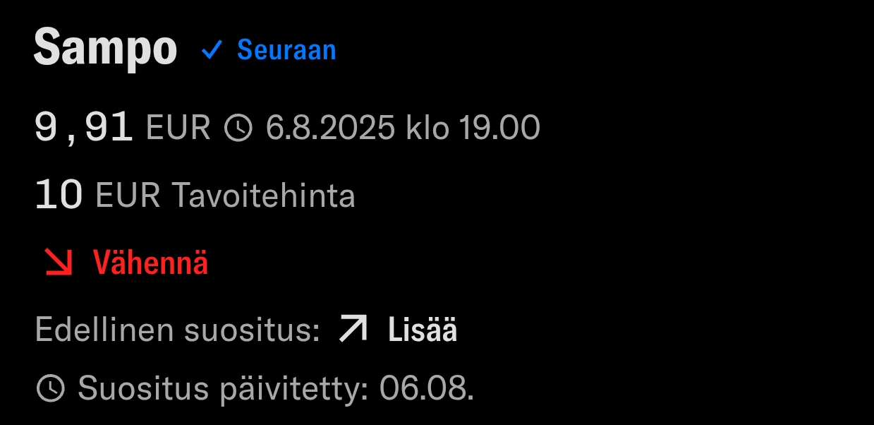 Hieman lisää tietoa näistä analyyseistä on saatavilla: https://www.investing.com/news/analyst-ratings/berenberg-reinstates-sampo-oyj-stock-with-buy-rating-eur1120-target-93CH-4120399