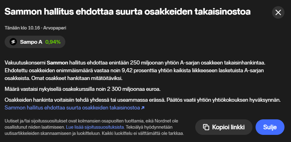 Sampo reagerede på den institutionelle efterspørgsel efter Noba-aktien og besluttede altruistisk at forbedre Noba-aktiens likviditet ved at sælge en del af sine Noba-aktier før tid. Som et biprodukt blev forudsætningerne for Sampos egne aktietilbagekøb naturligvis en smule forbedret. Jeg tvivler på, at det kan betale sig at bygge en særlig stor retssag op omkring det.![]()