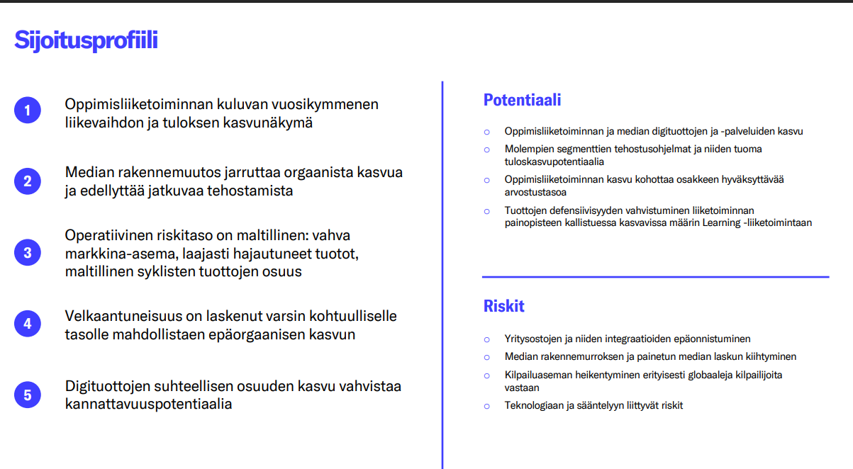 Sanoma’s earnings growth outlook for the coming years is very good, as curriculum reforms are being implemented in the major operating countries of the learning business, which has a strong market position in the European educational materials market, and the segment’s efficiency has increased through operational streamlining. Relative to our estimated earnings growth, the stock is valued quite moderately, which, combined with Sanoma’s moderate risk level, creates a very attractive risk-reward ratio. Thus, we reiterate our Buy recommendation for Sanoma and our target price of 11.5 euros.