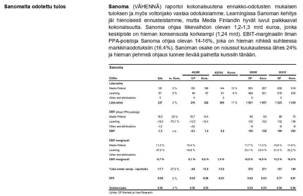 Sanoman Q4 ulkona ja tässä aamarikommentti: Sanoma Q4: Tulos, osinko ja näkymät odotuksien mukaisia | Inderes: Osakeanalyysit, mallisalkku, osakevertailu & aamukatsaus