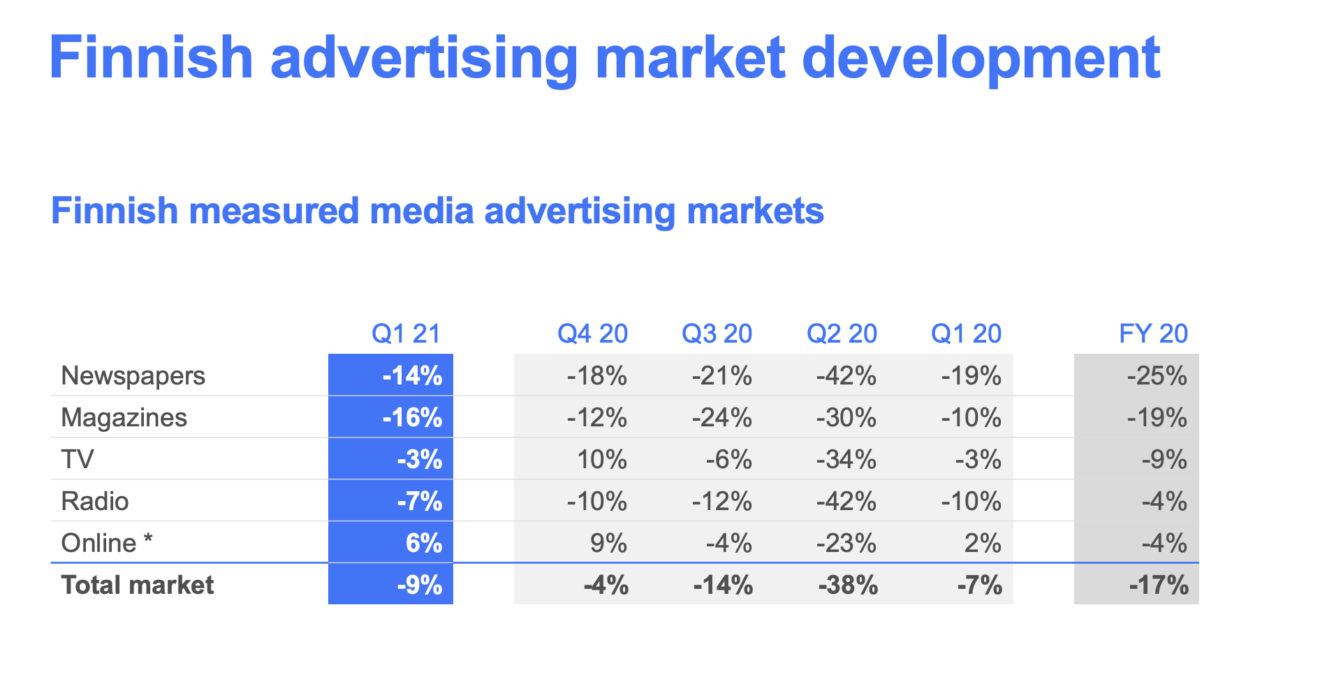 Tässä vielä grafiikka Suomen mainosmarkkinan jakautumisesta.