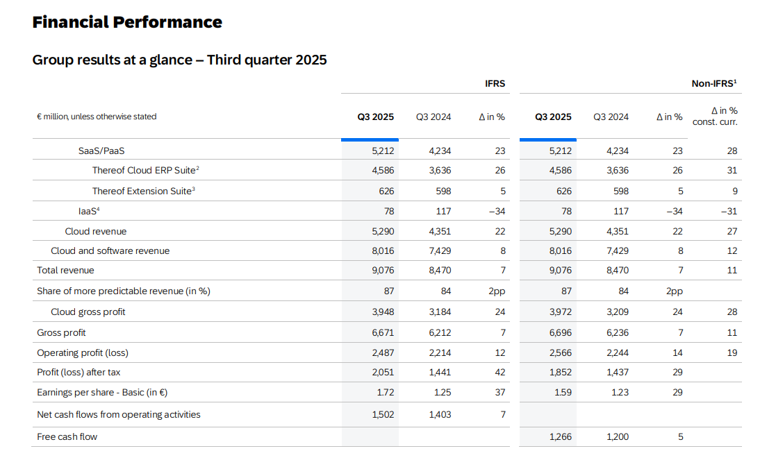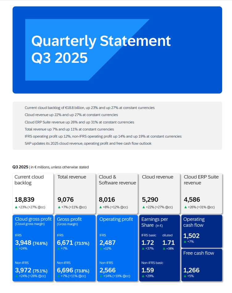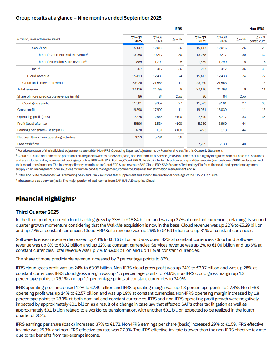 SAP:n kolmas neljännes oli vahva tuloksellisesti, vaikka pilviliiketoiminnan kasvu hidastui. Yhtiö onnistui pitämään kulut tiukassa kurissa ja nosti vielä tämän vuoden 2025 tulos- ja kassavirtaennusteitaan. Samalla se kuitenkin laski pilvituottojen ohjausta aiemman vaihteluvälin alapäähän, mikä kertoo toisaalta varovaisemmasta näkymästä.