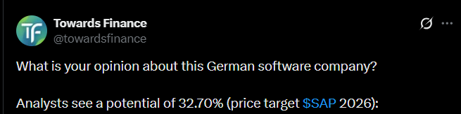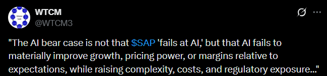 Tässä on tekoälykeskeinen ja karhuinen tviitti SAPista, jossa tulee esille, että SAP kohtaa merkittäviä tekoälyyn liittyviä haasteita, kuten esimerkiksi hitaan kaupallistamisen, kiristyvän kilpailun ja korkeat operatiiviset kustannukset.