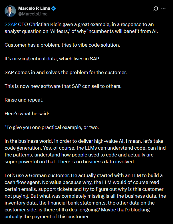 Alla olevassa tviitissä nostetaan esille, miten SAP:n toimitusjohtaja kertoo, miksi tekoäly toimii parhaiten, kun se yhdistetään oikeaan yritysdataan. Eli pelkkä tekoäly ei riitä, vaan tarvitaan myös taustatietoa. Siksi SAP pystyy auttamaan kuulemma yrityksiä tekemään parempia päätöksiä ja kehittämään uusia palveluja.