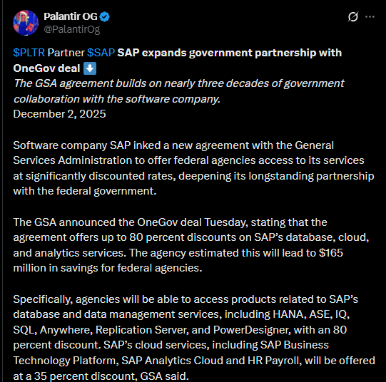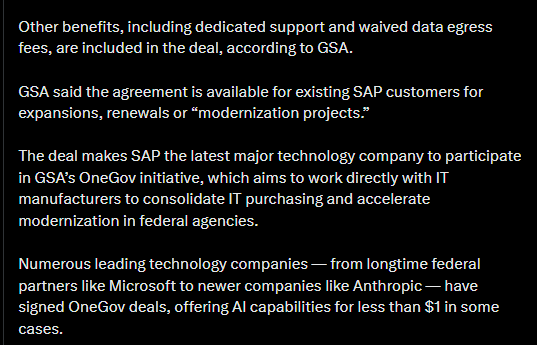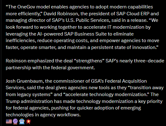SAP liittyy näin muiden suurten teknologiayhtiöiden joukkoon edistämään Yhdysvaltain hallinnon IT-uudistuksia ja nopeampaa tekoälyn käyttöönottoa.