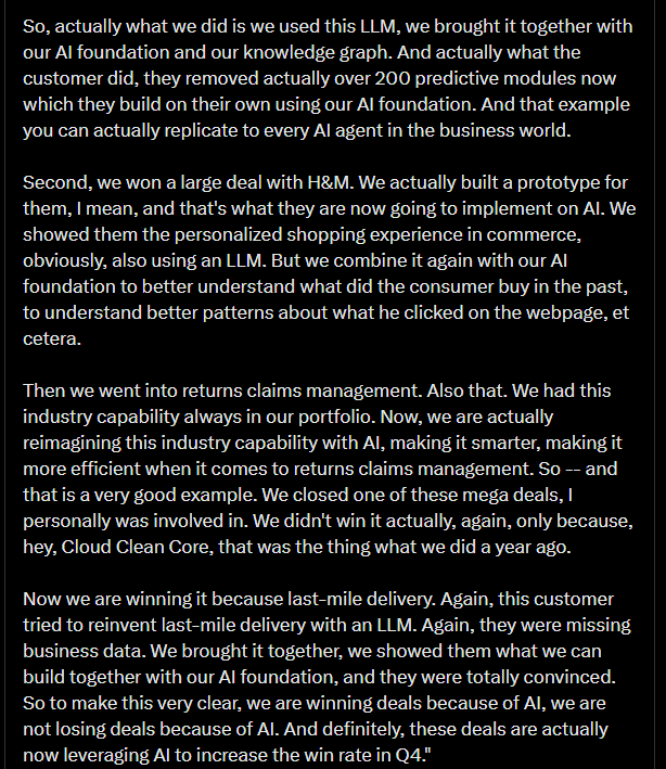 Now we are winning it because last-mile delivery. Again, this customer tried to reinvent last-mile delivery with an LLM. Again, they were missing business data. We brought it together, we showed them what we can build together with our AI foundation, and they were totally convinced. So to make this very clear, we are winning deals because of AI, we are not losing deals because of AI. And definitely, these deals are actually now leveraging AI to increase the win rate in Q4."