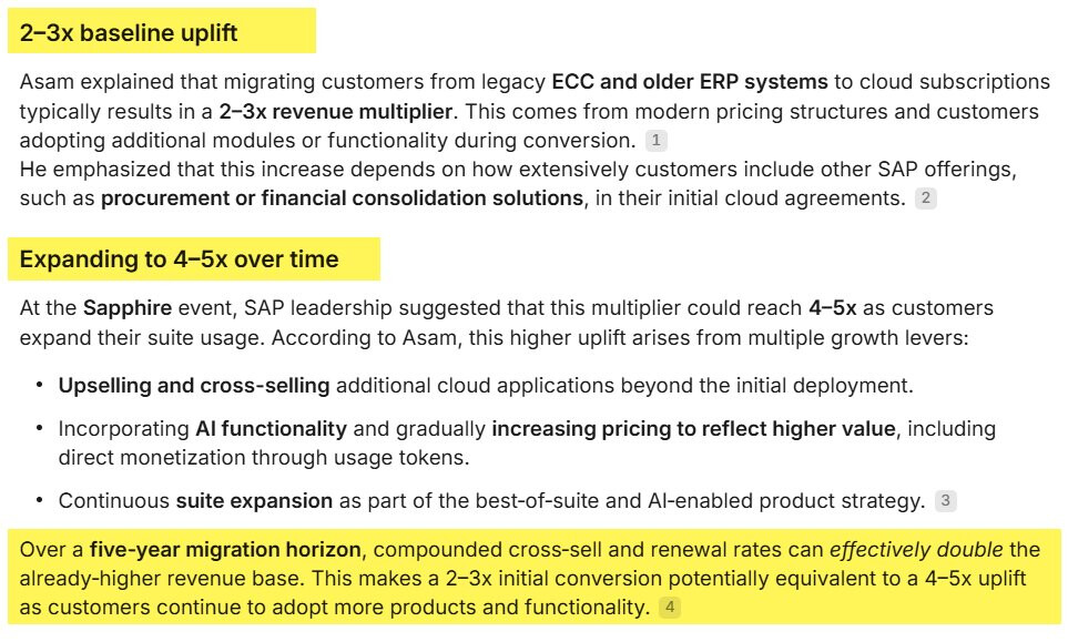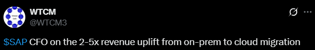 Alla olevassa tviitissä kerrotaan, että SAP:n mukaan siirtyminen on-prem-ratkaisuista pilveen tuottaa yleensä 2–3× lisätuloja, jotka voivat kasvaa 4–5× tasolle ajan kanssa lisämyynnin, ristiinmyynnin, AI-pohjaisen hinnoittelun ja laajemman sovelluskokonaisuuden käytön myötä.