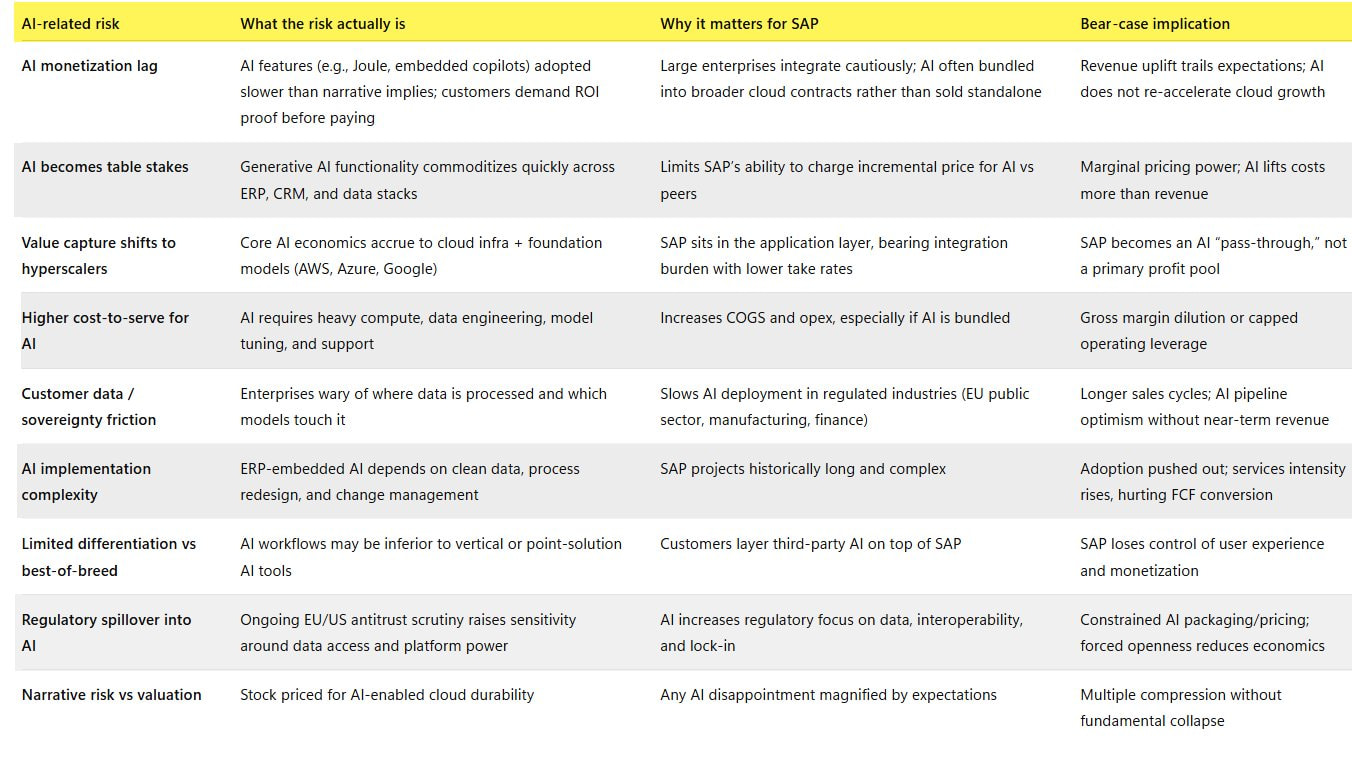 Arvonmuodostus saattaa siirtyä pilvijäteille, ja tiukka sääntely sekä monimutkaiset datavaatimukset hidastavat käyttöönottoa eikä SAP välttis pääse osingoille. Lisäksi myös tekninen monimutkaisuus ja korkeat kasvuodotukset luovat merkittäviä taloudellisia riskejä, mikäli se SAP ei tekoälyjensä kanssa lunasta markkinoiden sille asettamia kovia tavoitteita.