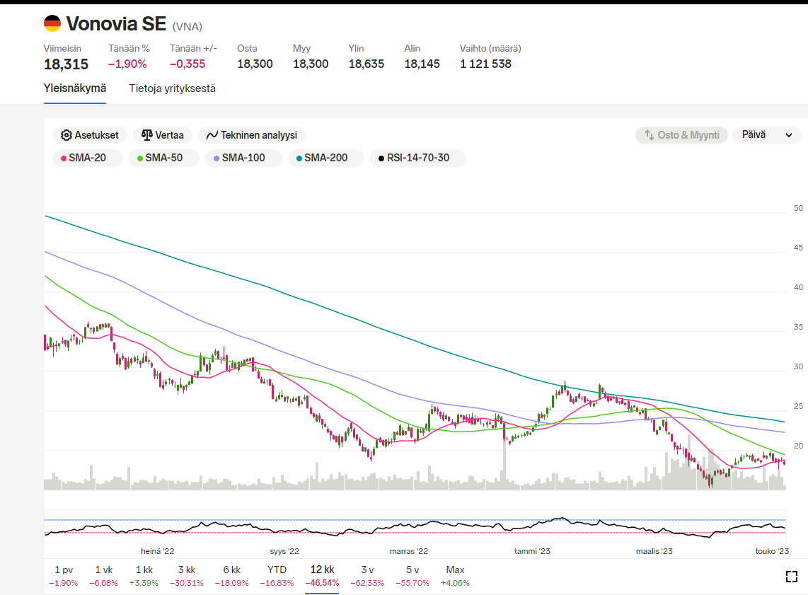 Esim. Vonovia tosiaan leikkeli maaliskuussa osinkoa -50%, mutta kurssi onkin lähtenyt sen jälkeen ylös, kun firman tilanne sijoittajien silmissä on alkanut parantumaan vaikeasta makrosta huolimatta.
