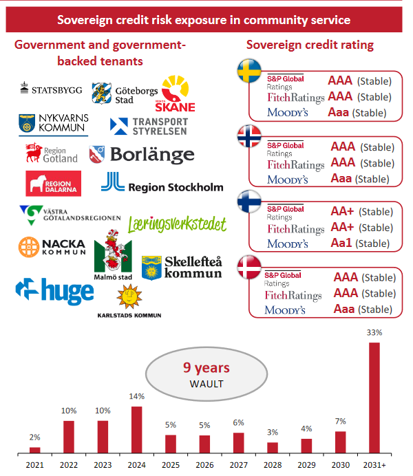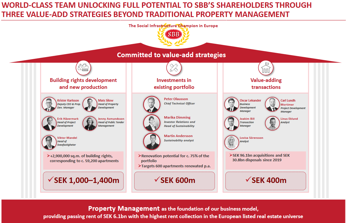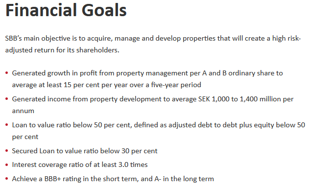 SBB sijoittaa pohjoismaisiin kiinteistöihin , joissa vuokralaiset ovat valtion rahoittamia tai ruotsissa korkean sääntelyn piirissä, esimerkiksi Koulut, Poliisiasemat, Terveyskeskukset. Yhtiön keskimääräinen vuokrasopimus(WAULT) on tällä hetkellä 9vuotta.