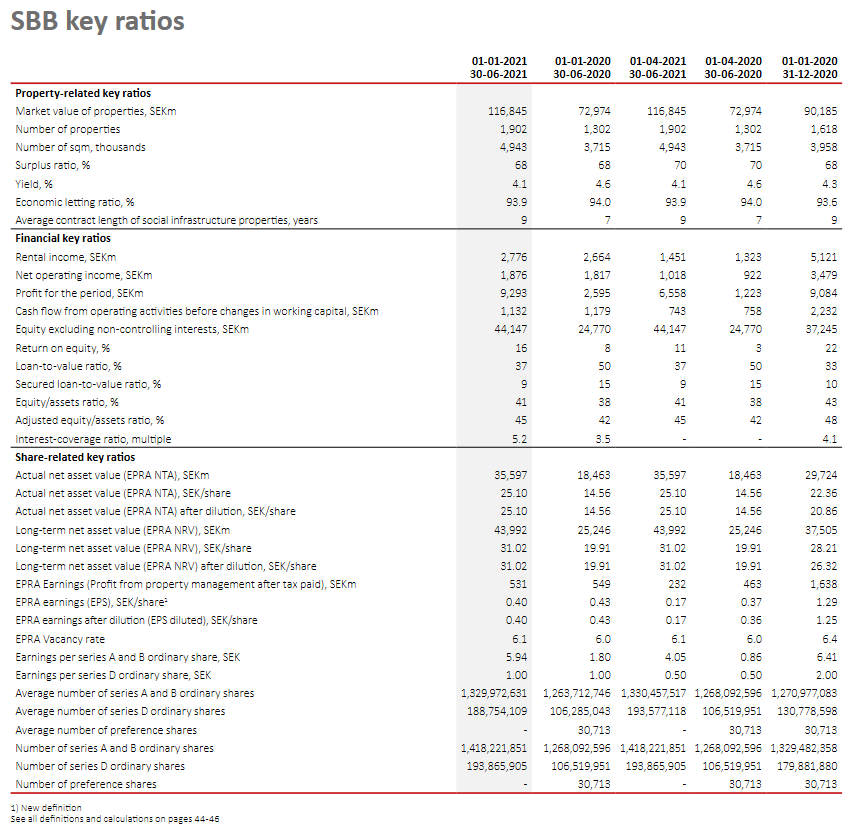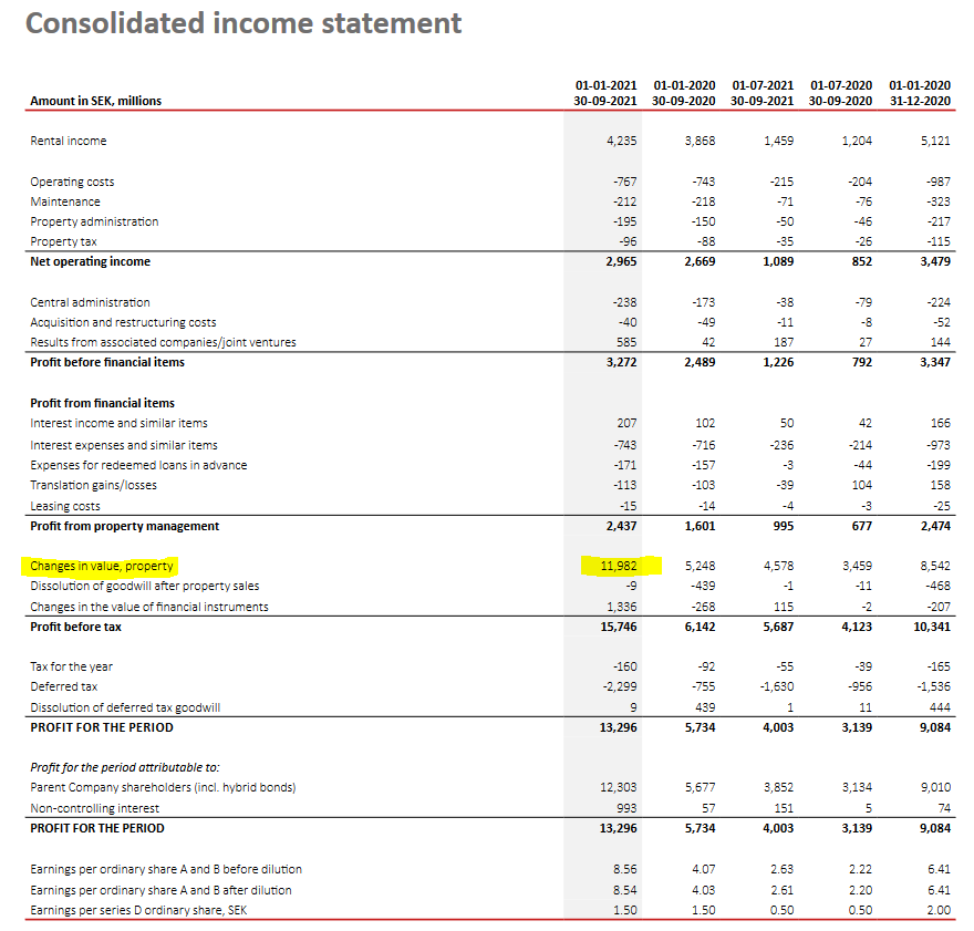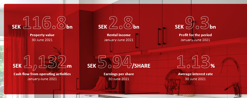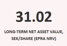 Epra NAV nousi; " Long-term net asset value (EPRA NRV) calculated in accordance with EPRA’s new guidelines for net asset value calculations was SEK 49,296m (37,505), corresponding to SEK 34.55 (28.21) per share. "