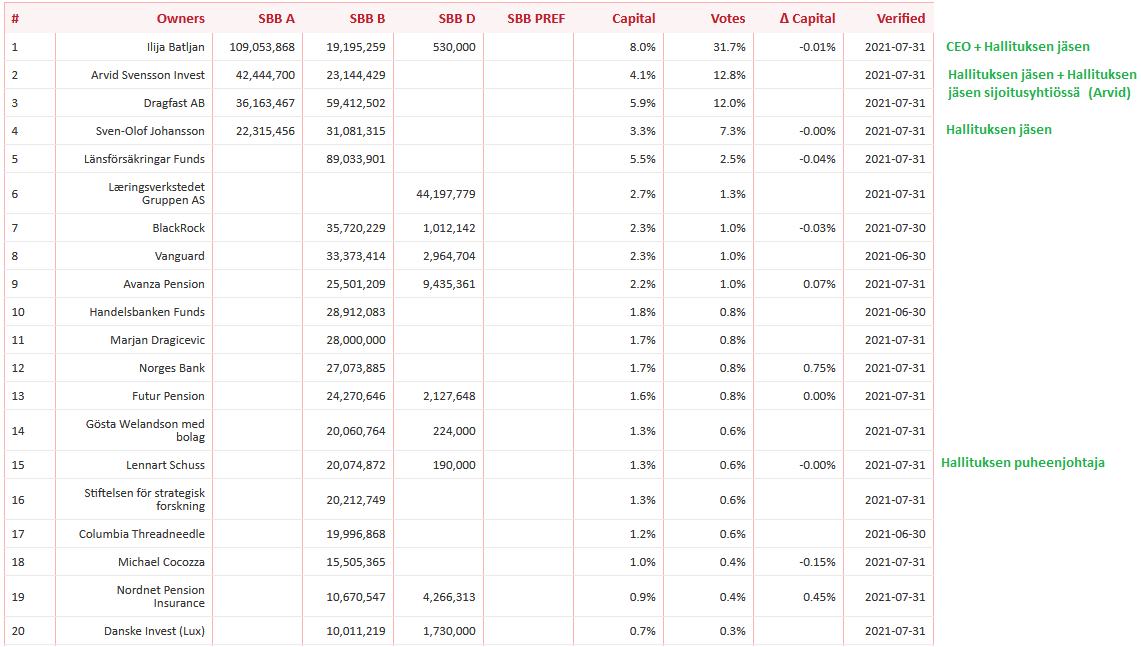 Viimeaikaisen kurssinousun vuoksi, yhtiötä arvostetaan aika mehukkaalla preemiolla verrattuna kiinteistöjen arvoihin. [ 50SEK vs EPRA NRV 31SEK Q2 ]. Allekirjoittanut omistaa pienen position SBB B-class, Cibuksen ja Cityconin rinnalla.