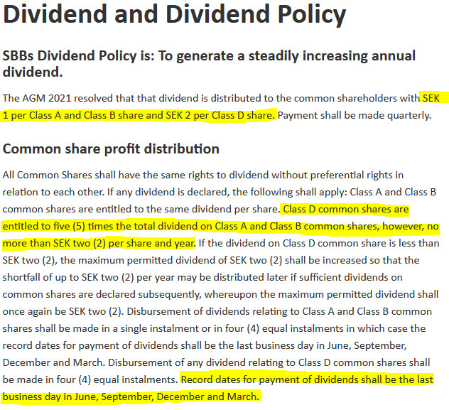 Record dates for dividend distribution to Class A shares and Class B shares shall be the last weekday for each calendar month with one twelfth (SEK 0.11) per disbursement date and beginning 29 April 2022. Record dates for dividend distribution to Class D shares shall be 30 June 2022, 30 September 2022, 30 December 2022 and 31 March 2023 with an amount of SEK 0.50 per disbursement date. Distribution of dividends is expected to be made by Euroclear Sweden AB three banking days after each record date.