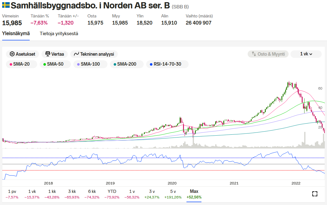 Tämähän on tullut melkoisesti alas, alle 20 kruunun kurssissa pyörii nyt. Kiinteistöpuolella toki odottaa kovat ajat kun kirjanpitovoittoa ei saa tehtyä ja korot alkavat nousta, mutta olisiko tällä saumaa tehdä kohtuullista tulosta jatkossa?