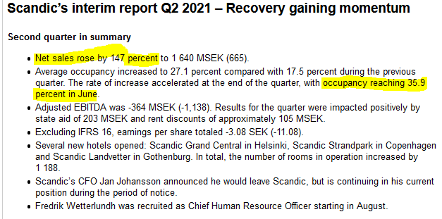 Tuorein osavuosikatsaus q2 ilmestyi tänään. Matkailubisnes näyttää elpyneen hyvin. EPS = 2.44 SEK, jos samalla tasolla säilyy läpi vuoden niin PE ~ 4. Kurssireaktio aika laimea hyvästä tuloksesta huolimatta