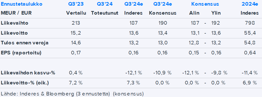 - Oikaistu liikevoitto oli 12,4 (15,2) milj. euroa, laskua 18,4 %. Liikevoitto oli 12,1 (15,2) milj. euroa, laskua 20,4 %