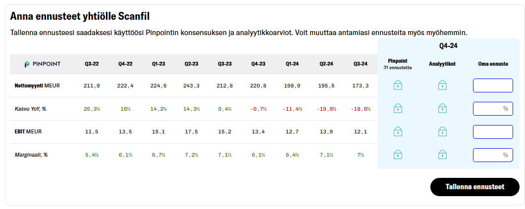 Kuka tahansa Scanfilistä kiinnostunut voi jättää arvionsa ennen tulevaa raporttia! Tällä hetkellä saatavilla on 31 arviota, ja pääset niihin käsiksi jättämällä omat odotuksesi. Arviointitaulukko löytyy täältä (vieritä sivua alaspäin): Scanfil - Inderes