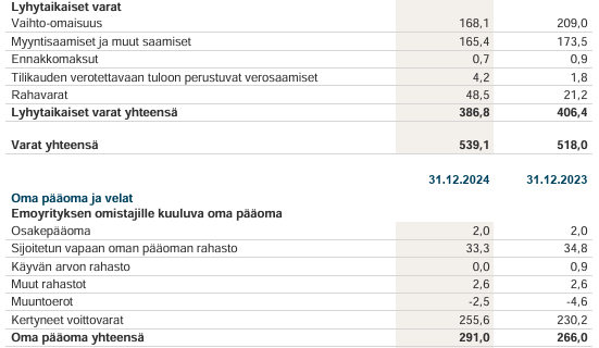 Ihan hyvätä näyttää lähtökohdat vuoteen 2025 ja tulevaisuuteen. Tase vahva ja kassassa hyvin rahaa. Hivenen inmetyttää osinko 0,24 € kun menty useampi vuosi 0,02 korotuksin. Tähän olisi hyvä saada yritykseltä vastausta. Tavallaan aiheuttaa kaksijakoisia mietteitä ja niistä tavallaan positiivisempi puoli on position kääntyminen voimakkaamman kasvun suuntaan uuden toimitusjotajan kaudella. Tähän antaa osviittaa vuoden 2024 loppupuolella toteutettu yritysosto ja Scanfilin vahva kassa, matalahko osinko yhdistettynä kykyyn vivuttaa hankintoja hyvällä taseasemallaan. Tärkeä kuitenkin säilyttää korkea laatuvaatimus hankinnoille ja niiden tuottopotentiaalille, mitä Scanfil on osoittanut PartnerTech yrityksen ostosta lähtien. Vaativa isännällinen talo tulee varmaan olemaan kriittinen mahdollisesti hankittaville kohteille, mutta pienoista rohkeuden kasvua havaittavissa ilmassa.