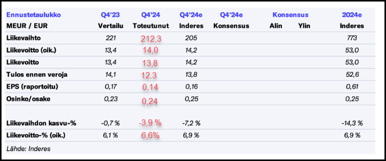 Liikevaihto ja oikaistu liikevoitto olivat lähellä markkinoiden konsensusennustetta (LSEG) Q4:llä. Koko vuoden 2025 liikevaihto- ja liikevoitto-ohjeistuksen keskikohta oli myös lähellä konsensusodotuksia. Scanfil odottaa loppukysynnän kiihtyvän vähitellen tänä vuonna. Kuitenkin koko vuoden liikevaihdon kasvuohjeistuksen vaihteluväli on suhteellisen laaja 0-18 %. Uskomme, että näkyvyys ei ole kovin hyvä. Orgaaninen liikevaihdon kasvu ilman SRXGlobalin yritysostoa oli Q4:llä -9 % vuodentakaisesta laskelmiemme mukaan. Suhteellinen kannattavuus pysyi hyvällä tasolla Q4:llä haastavasta markkinasta huolimatta. Osinkoehdotus on 0,24 euroa (konsensus 0,25 euroa).