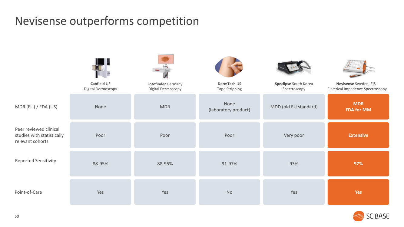 Kilpailun osalta emme ole tunnistaneet yhtiölle selkeää kilpailukykyistä haastajaa. Myös Darrell Rigelin puheenvuoro oli tämän suuntainen. SciBasen teknologian turvana on nippu patentteja sekä pitkä teknologinen ja tutkimuksellinen kehityspolku, joka tuo yhtiölle vallihautoja. Olisi tietysti kummallista jos haastajaa ei ilmaannu, mutta toistaiseksi tilanne näyttää seesteiseltä ja SciBase kilpailee etenkin kliinistä standardia (dermatoskoopilla visuaalinen arvio) vastaan.