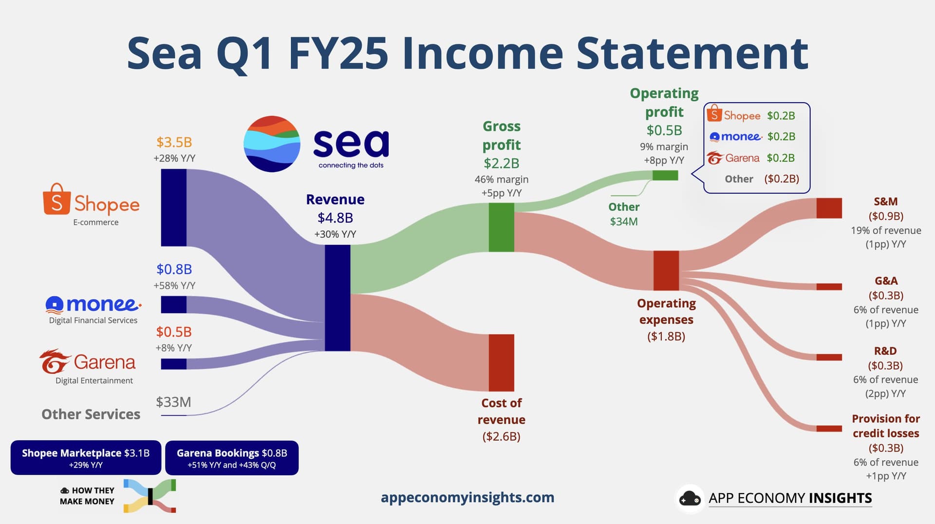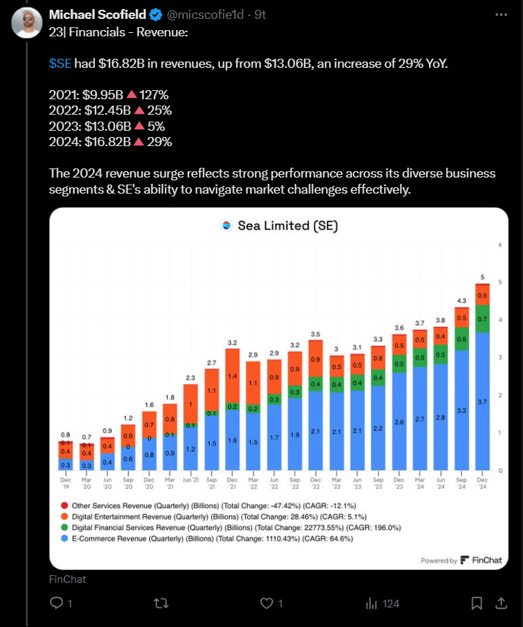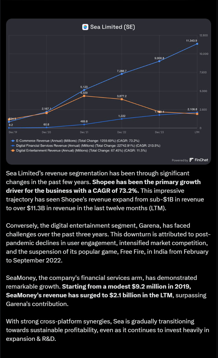 Sea Ltd. is a technology giant operating in Southeast Asia. The company has three subsidiaries that focus on different aspects of its business: Garena (video games), Shopee (e-commerce), and SeaMoney (fintech).