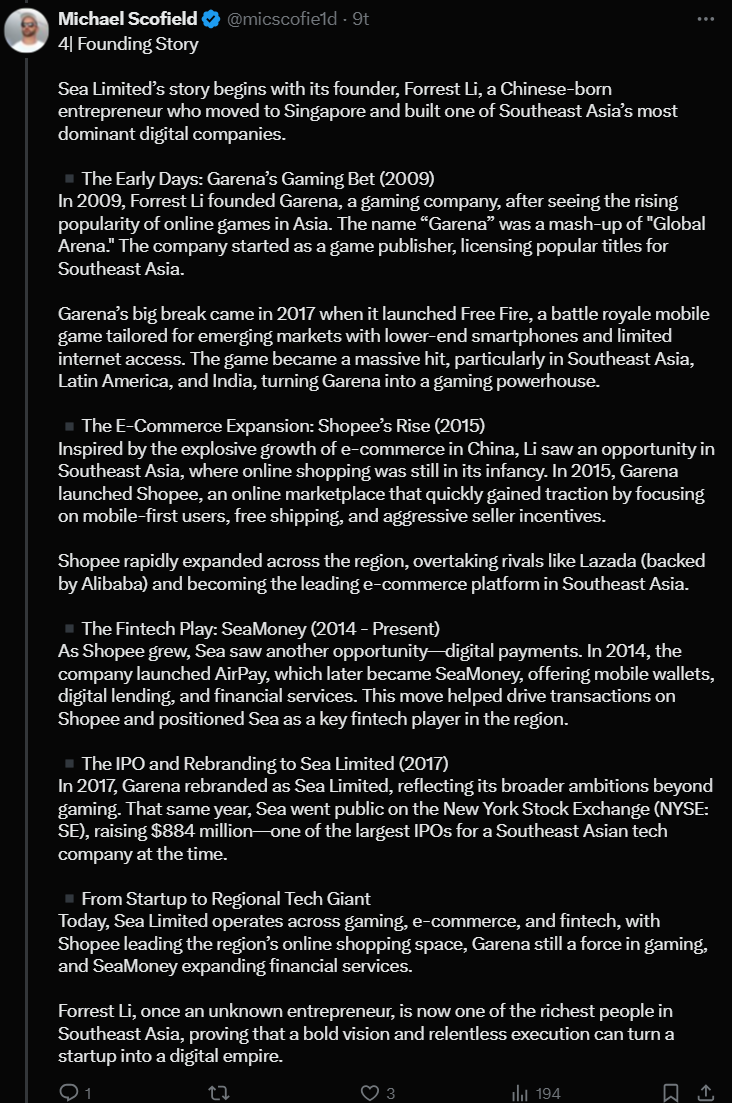 Here’s a good article about the company’s and management’s history: Forrest Li’s Sea Ltd Surges As Pandemic Drives Digitalization Across ASEAN