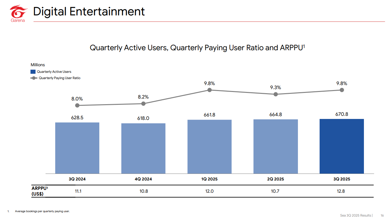 -Garena er virksomhedens eneste profitable datterselskab. Q3: “Adjusted EBITDA was US$584.5 million, up 119.8% year-on-year.”. Garenas overskud investeres primært i Shopees aktiviteter.