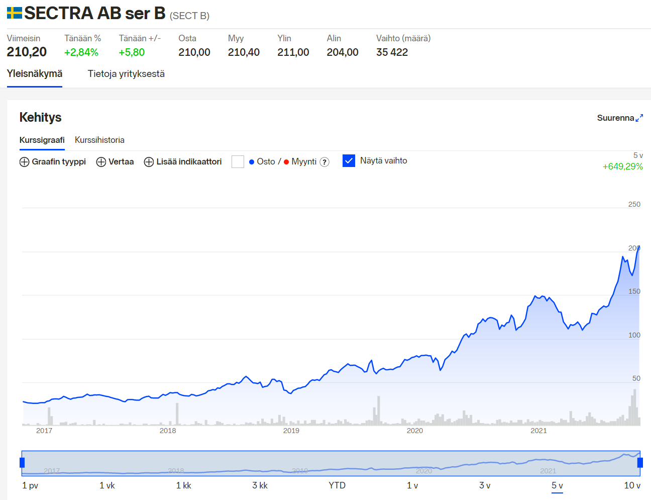Itse olen ollut itseltäni salaa Sectran kyydissä jo useita vuosia. Aluksi täysin älyttömäksi osoittatuneen Nordean Selecta vakuutusrahaston kautta, johon säästin vuosituhannen vaihteessa ja joka myytiin minulle hiukan väkisin pankin tiskillä (silloin kun vielä asioitiin konttoreissa ). Tästä virheestä oli kuitenkin se hyöty, että tulin siten tutustuneeksi tarkemmin rahaston sisältämiin yhtiöihin ja mm. tähän Sectraan Se kun rahaston vuosiraporteissa toistuvasti oli mukana aina vaan suuremalla ja suuremmalla osuudella ja myöhemmin sitä jopa ihan kehuttiin erikseen rahasto-esitteessä. Itsenäistä osaketta ostin ekan kerran pari-kolme vuotta sitten ja sitä on tullut tankattua muutaman kerran, viimeksi tämän kevään dipistä, mistä kurssi on jo lähes tuplaantunut. En ole katunut. Kun kurssi tämä vuonna läheni 1000 SEK niin se splitattiin äskettäin 5:1. Sectra on perustettu vuonna 1978 ja listattu Nasdac Stocholm 2014. En tiedä tarkalleen milloin rahasto otettiin Nordean Nordic Small Cap -rahastoon, jota minun on pakko omistaa eläkkeelle saakka. Viimeiset viisi vuotta kurssi ollut pääosin ylämäkeä ja tänään firman markkina-arvo oli jo 39 373,05 MSEK