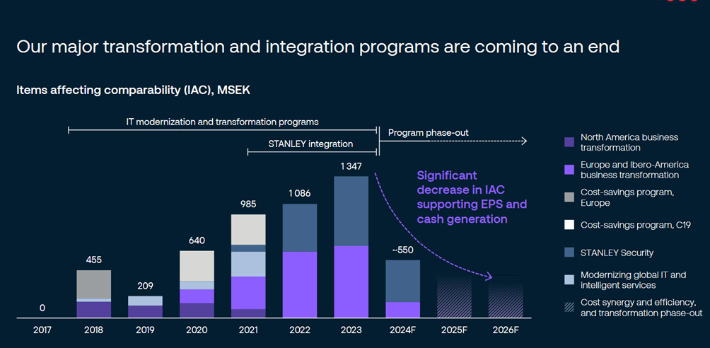 Securitas’ regnskabsaflæggelse minder meget om den finske TietoEVRY, fordi der er masser af engangsomkostninger, der skal justeres for i resultatopgørelsen. Herover er det illustreret, hvor engangsomkostningerne hos Securitas stammer fra. Den væsentligste enkeltårsag er naturligvis Stanley-integrationen, men der er også blevet ryddet kraftigt op i forretningsenhederne på andre områder. Toppen for disse engangsomkostninger blev set i 2023, og herfra er de faldet, selvom nedlukningen af SCIS-forretningen gav yderligere justeringer i 2025. På grund af disse konstante justeringer har jeg selv i højere grad fokuseret på de rapporterede tal.
