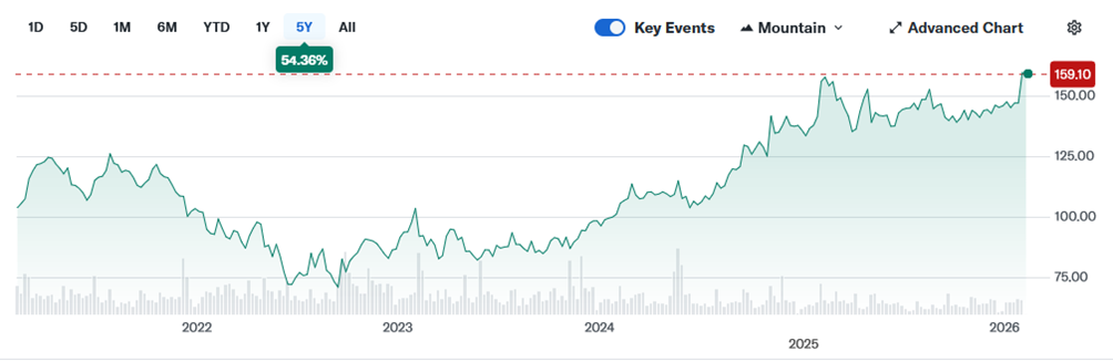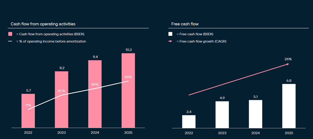 Sammen med resultatet er det også lykkedes selskabet at øge sin pengestrøm. Dette fremgår af figuren nedenfor. Selskabet betaler også udbytte. For resultatet i 2025 bliver udbyttet 5,30 SEK. Udbyttet er i de seneste år blevet udbetalt med ca. 40-60 % af resultatet.