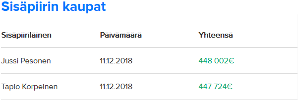 äkkiä kun laskee niin 5M -2,5M =2,5Miljoonaa ja siitä sit ostaa 450k € firman osakkeita → n. 18%lla verojen jälkeisel ansiolla. Tietenkin nuissa ansiotulomäärrissä kaikki on vaan suhteellista… 20K upm osakkeita → inderesin 2018ennustuksella se tuo jo 27K € osinkoja.