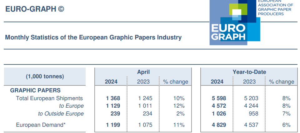 Painopaperimarkkinoiden hyvä veto Euroopassa jatkui huhtikuussa. Tämä lupaa hyvää UPM:lle, jolle tämä segmentti on yhä tärkeää liiketoimintaa, vaikkakin supistuu vuosi vuodelta. (Lähde: Eurographin 21.6 julkaistu tilasto.)