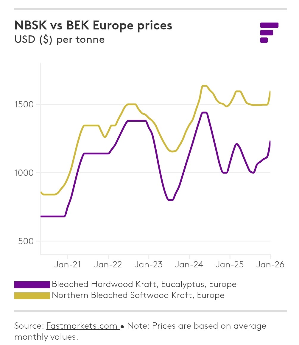 Fastmarkets assessed pulp, northern bleached softwood kraft (NBSK), spot, dap Europe, at $730-745 per tonne net in January on February 10, up by $10-15 per tonne from the December level of $720-730 per tonne. This was based on business transacted on a euro basis more or less unchanged from December, but the exchange rate pushed the dollar level upward.