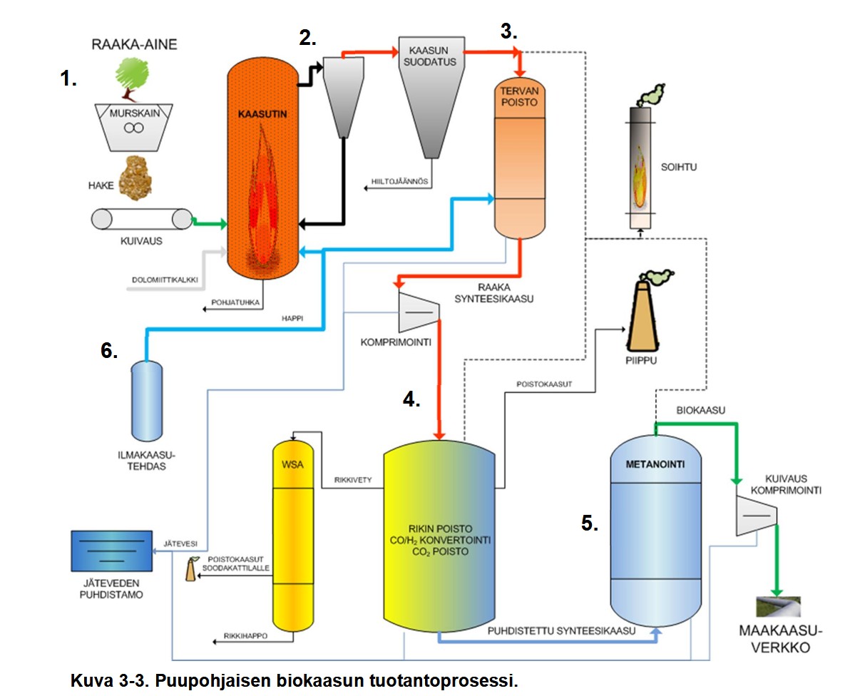(Kuvan lähde: GASUM OY, HELSINGIN ENERGIA JA METSÄ FIBRE OY. Joutsenon puupohjaista biokaasua tuottava biojalostamo. Ympäristövaikutusten arviointiohjelma. Helmikuu 2013. Pöyry Finland Oy)