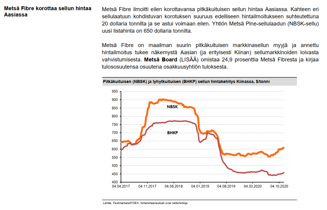 Käsittääkseni Aasian/Kiinan myynnin osuus on suurin Metsä Fibrellä ja myöskään leveä hintaero ei ole Metsä Boardille ainakaan huono asia (käytännössä koko lähes koko selluylijäämä havusellua). Näin ollen sellumarkkinan lyhyen ajan suuntimat hyödyttänevät suomalaisyhtiöstä eniten Metsä Boardia.