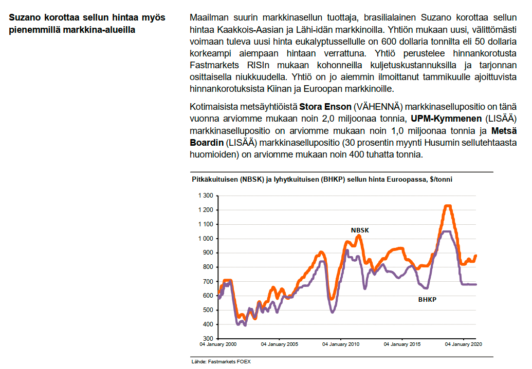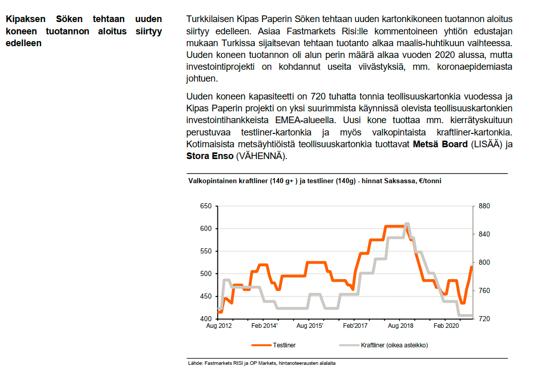 Metsä Board julkisti myös seuraavasta kartonki-investoinnistaan suunnitelman viime viikolla, ja vähemmän yllättäen seuraava liike on todennäköisesti korkean rajamarginaalin tarjoava sekä maltillisesti pääomaa sitova Husumin taivekartonkikoneen kapasiteetin nosto 200 000 tonnilla. Tällä keskikokoista taivekartonkikonetta vastaavalla investoinnilla Metsä Board päässee noin 5 vuotta eteenpäin taivekartonkien kasvun suhteen ja mainitulla pohjalta lisäinvestoinnille yli 12 %:n ROCE-%:n saavuttaminen on tuskin erityisen vaikeaa. Tätä pullonkaulaprojektia seuraava investointi vuosikymmenen loppupuolella tuskin enää onnistuukaan Metsä Boardilta aivan yhtä kätevästi, sillä Husumin kapasiteetin nosto vienee loput Metsä Boardin vapaasta (ts. nyt markkinoille myytävästä) mekaanisen massan kapasiteetista ja jatkossa taivekartonkituotannon lisääminen vaatinee investointeja myös BCTMP:n valmistukseen (ts. pääomaa sitoutuu enemmän ja korkean ROCE-%:n saavuttaminen on siten hankalampaa). Sijoittajien murhe tämä ei toki vielä ole, mutta lajin luonnetta ei ole syytä unohtaa.