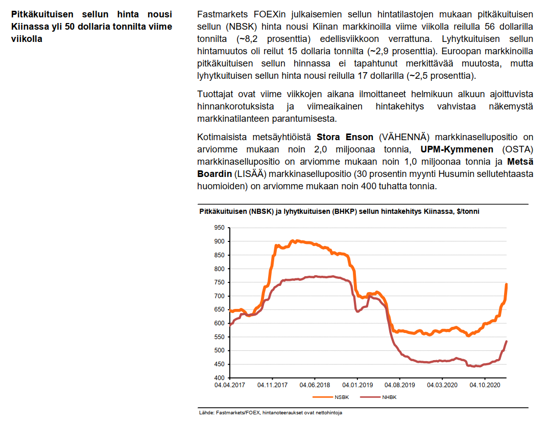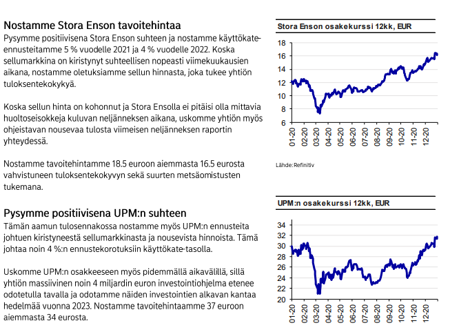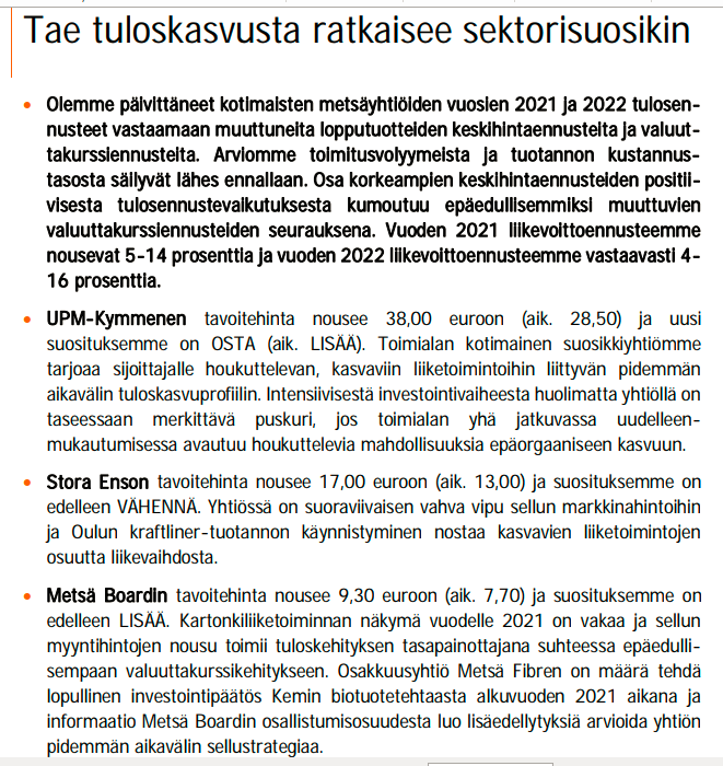 Sektorin iso kuva selviää luultavasti varsin hyvin tältä pohjalta. Suunnan pitäisi olla ylöspäin, mutta kulmakerroin on epäselvä, sillä ajureita löytyy molempiin suuntiin. Positiivisella puolella on ainakin talouksien avautuminen/elpyminen 2021 aikana, sellun taalahinnan reipas nousu, pakkausten ja puutuotteiden hyvä kysyntä ja hintojen korotukset sekä viime vuoden aikana tehdyt säästötoimet. Vastapainoina sitten vahvempi EUR/USD sekä tiettyjen kuluerien (esim. ainakin keräyspaperi, logistiikka, energia) ainakin väliaikainen inflaatio tai normalisoituminen sekä paperimarkkinan synkkyys (volyymit ja indeksien perusteella myös hinnat).