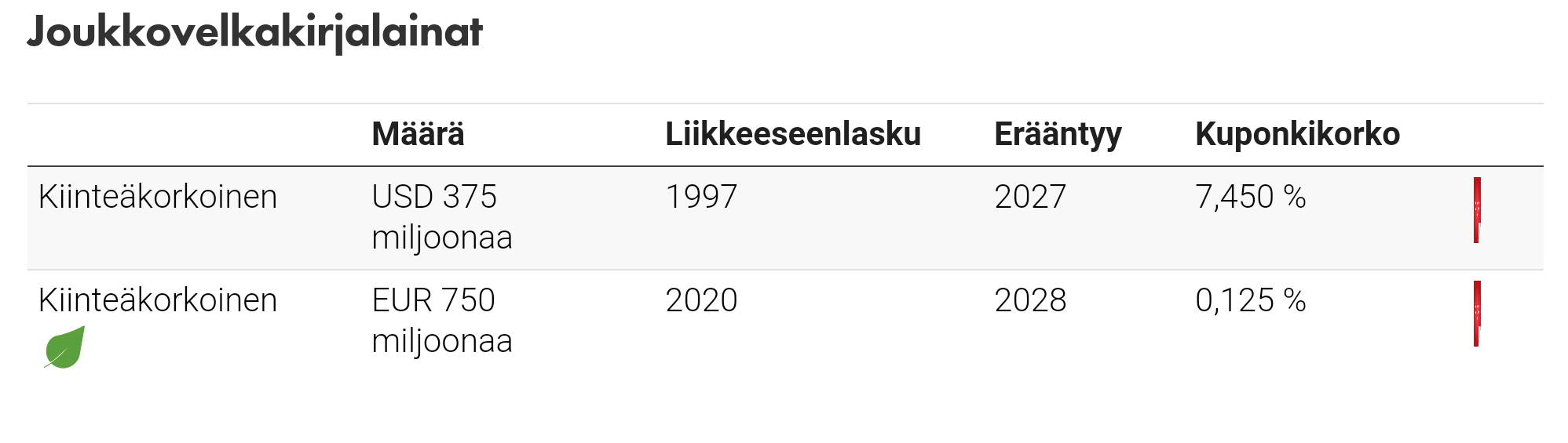 “UPM on laskenut onnistuneesti liikkeeseen uuden 500 miljoonan euron vihreän joukkovelkakirjalainan EMTN-joukkovelkakirjalainaohjelmansa (Euro Medium Term Note) sekä vihreän rahoituksen viitekehyksensä alla. Joukkovelkakirjalaina erääntyy maaliskuussa 2031, ja lainalle maksetaan kiinteää 0,50 prosentin korkoa.”