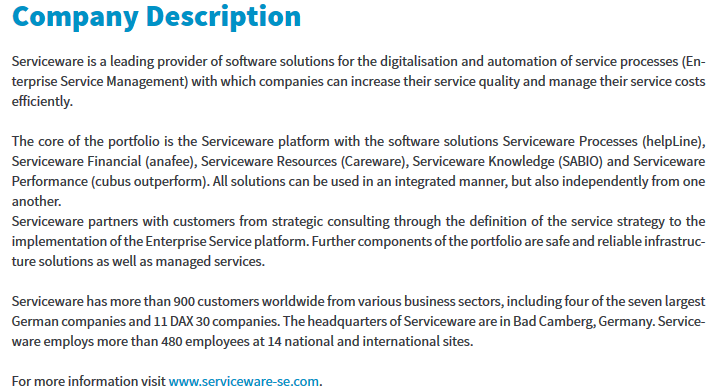 Yhtiöllä on todella vakuuttava vakuuttava asiakaskanta. Neljä kappaletta Saksan seitsemästä suurimmasta yhtiöstä ovat Servicewaren asiakkaita, sekä 12 kappaletta DAX 30 yhtiöistä! Ohessa esimerkkejä yhtiön asiakkaista, jotka ovat varmasti sijoittajille tuttuja: