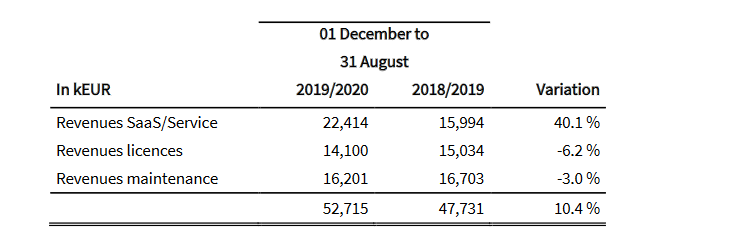 Servicewarella on sekä vanhaa lisensseihin ja infrastruktuurin ylläpitoon perustuvaa bisnestä, mutta strategian mukaisesti niiden roolia ollaan vähentämässä ja transformaatio ESM-SaaS-liiketoimintaan on käynnissä. Ohessa Q32020 YTD (huomioi että yhtiöllä on tavanomaisesta poikkeava kalenterivuosi):