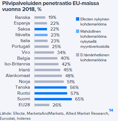 Markkinoilla pitäisi kyllä olla tilaa kasvaa myös uusissa asiakkaissa. Oheinen kuva on Inderesin Efecten laajasta raportista. Huomioi Servicewaren kohdemarkkinat Saksa, Itävalta, Espanja ja Iso-Britannia: