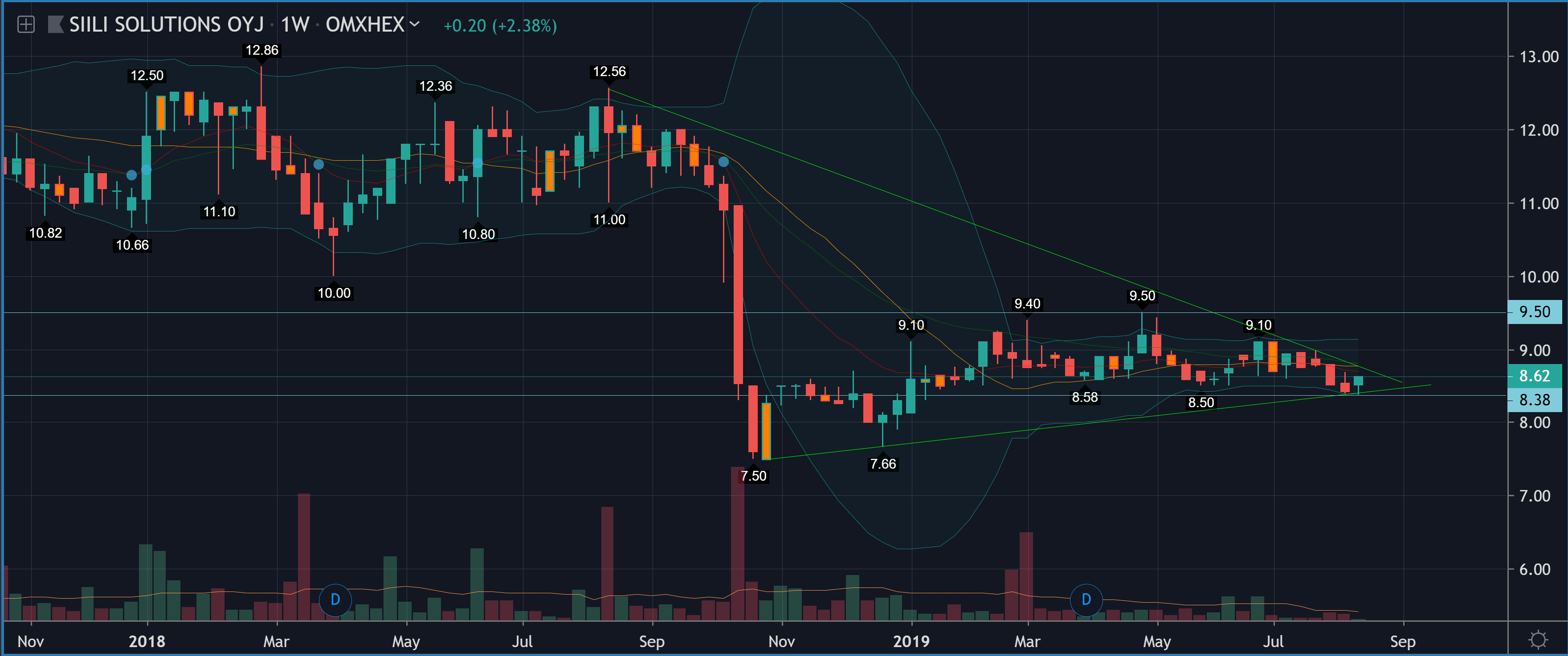 TA ei anna mairittelevaa kuvaa yhtiöstä. Tiukentuva wedge kertoo, että breikki jompaan kumpaan suuntaan tulee tapahtumaan lähiaikoina ja oddsit on laskun puolella.