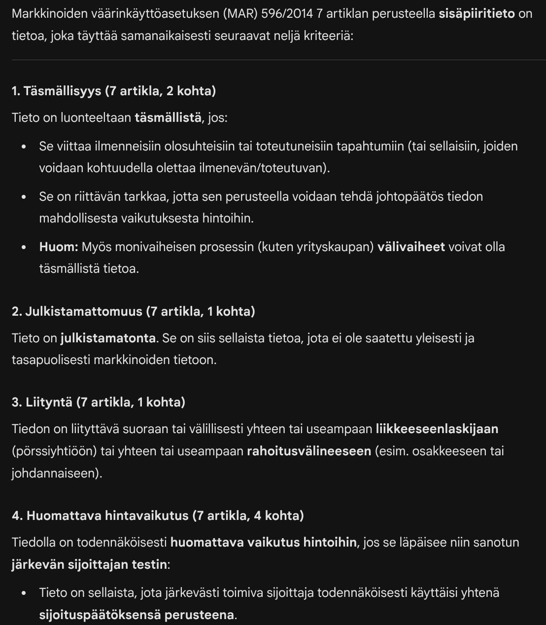 Eikös Atte tuossa kurssireaktiota pelännyt, joten rivien välistä on luettavissa, että hyvinkin harmaalla alueella oltiin, vaikka hän ei sisäpiiritiedoksi sitä halunnutkaan kutsua.