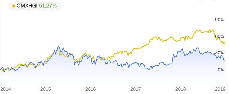 Laitan tähän vielä esimerkin, salkkuni vs. Helsingin pörssi tuottoindeksi 2014-2019. Salkku alkuun tuotti indeksin mukaisesti mutta 2016 lähti eri suuntaan ja lopulta oikoi senverta että 2019 oli tuon jakson jälkeen +15% voitolla kun Helsingin pörssiin sijoittamalla olisi saanut samaan aikaan +51%. Tuossa 2016-2018 oli jakso, jossa salkkuni siis laski indeksin mennessä ylöspäin.
